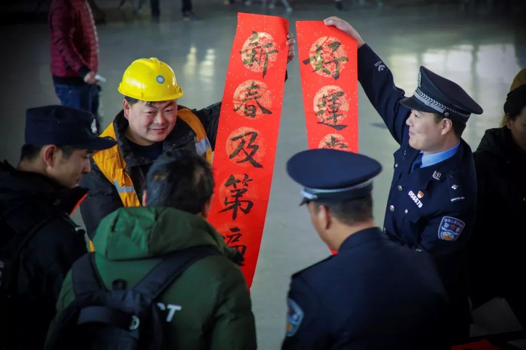2019-01-21,河南省洛陽市。為城市地鐵建設忙活一年的工人師傅也乘車回家過年,鐵路民警為其送上春聯,希望他們新年越來越好。作者:陳國軍