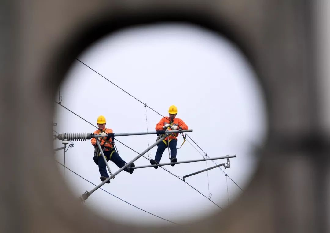 2019-02-06,江西九江。中國鐵路南昌局集團有限公司南昌供電段的職工在武九鐵路瑞昌區段檢修保養接觸網設備,以迎接節后鐵路運輸高峰。作者:江山如畫