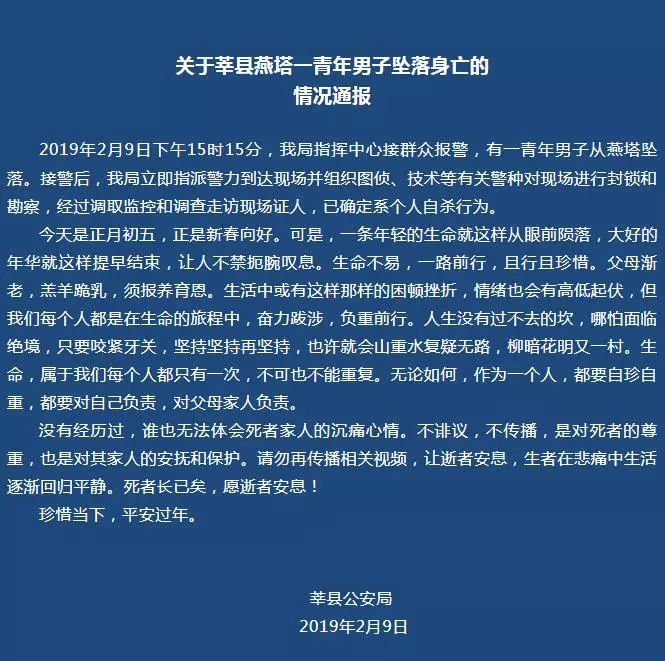 2月9日,山東莘縣公安局通過官方微信,通報(bào)了“莘縣燕塔一青年男子墜落身亡”事件。