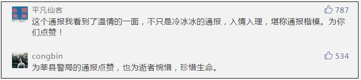 撰寫這份通報(bào)的莘縣公安局宣傳科室相關(guān)負(fù)責(zé)人稱,通報(bào)發(fā)布后,他們收獲了很多暖心留言。“其實(shí)我們這樣寫通報(bào)的原因很簡(jiǎn)單,就是站在死者家屬的角度、立場(chǎng)去考慮這個(gè)事情。”