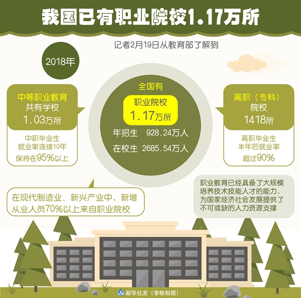 新華社北京2月19日電(記者胡浩)記者19日從教育部了解到,2018年,全國有職業院校1.17萬所,年招生928.24萬人,在校生2685.54萬人。職業教育已經具備了大規模培養技術技能人才的能力,為國家經濟社會發展提供了不可或缺的人力資源支撐。