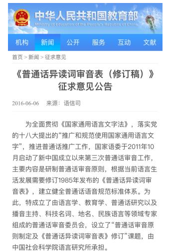 1985年,國家發(fā)布《普通話異讀詞審音表》,對一些異讀詞進行了修訂。2016發(fā)布的《<普通話異讀詞審音表(修訂稿)>征求意見稿》又對一些讀音進行了新的修訂,并發(fā)布在教育部網(wǎng)站上征求意見。