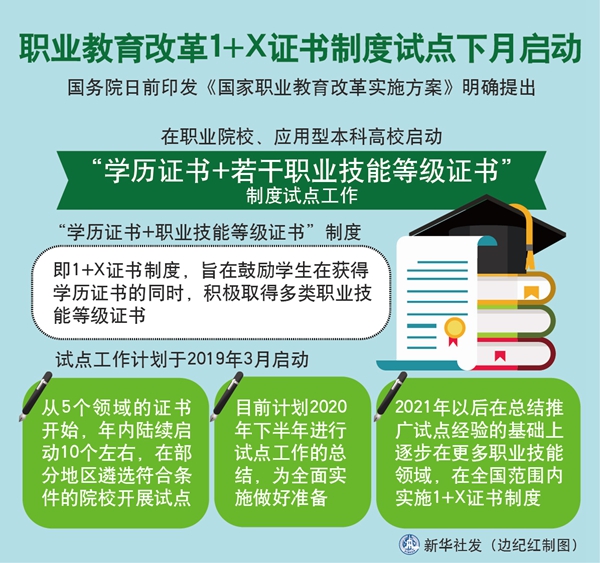 “職教20條”提出,從2019年開始,在職業院校、應用型本科高校啟動“學歷證書+若干職業技能等級證書”制度試點(以下稱1+X證書制度試點)工作。試點工作要進一步發揮好學歷證書作用,夯實學生可持續發展基礎,鼓勵職業院校學生在獲得學歷證書的同時,積極取得多類職業技能等級證書,提高就業創業本領,緩解結構性就業矛盾。