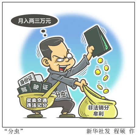 隨著私家車數量的持續快速增長,一些司機由于一年內違章次數較多,自己駕照記分不夠扣,由此催生了交通違法記分非法買賣現象。其中,低價買分、高價賣分的“分蟲”,成為這條產業鏈上的關鍵。