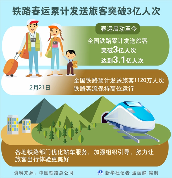 新華社北京2月21日電(記者樊曦)記者從中國鐵路總公司獲悉,春運啟動至今,全國鐵路累計發送旅客突破3億人次,達到3.1億人次。