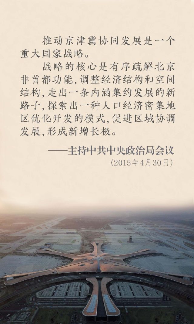 在京津冀協(xié)同發(fā)展每一個(gè)重要階段和關(guān)鍵環(huán)節(jié),習(xí)近平總書記都親自把脈定向,為京津冀協(xié)同發(fā)展工作指明方向。總書記多次強(qiáng)調(diào),京津冀協(xié)同發(fā)展是個(gè)大思路、大戰(zhàn)略,要通過(guò)疏解北京非首都功能,調(diào)整經(jīng)濟(jì)結(jié)構(gòu)和空間結(jié)構(gòu),走出一條內(nèi)涵集約發(fā)展的新路子,探索出一種人口經(jīng)濟(jì)密集地區(qū)優(yōu)化開(kāi)發(fā)的模式,促進(jìn)區(qū)域協(xié)調(diào)發(fā)展,形成新增長(zhǎng)極。