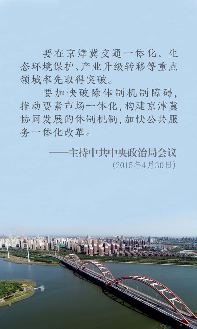 2013年5月,習(xí)近平總書記在天津調(diào)研時(shí)提出,要譜寫新時(shí)期社會(huì)主義現(xiàn)代化的京津“雙城記”。2013年8月,習(xí)近平總書記在北戴河主持研究河北發(fā)展問(wèn)題時(shí),又提出要推動(dòng)京津冀協(xié)同發(fā)展。總書記多次強(qiáng)調(diào),解決好北京發(fā)展問(wèn)題,必須納入京津冀和環(huán)渤海經(jīng)濟(jì)區(qū)的戰(zhàn)略空間加以考量,以打通發(fā)展的大動(dòng)脈,更有力地彰顯北京優(yōu)勢(shì),更廣泛地激活北京要素資源,同時(shí)天津、河北要實(shí)現(xiàn)更好發(fā)展也需要連同北京發(fā)展一起來(lái)考慮。