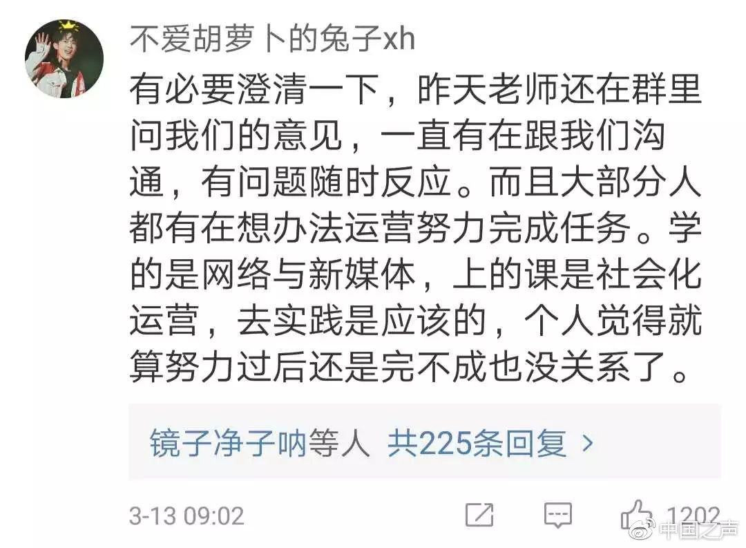 也有學(xué)生認(rèn)為,比起課本上知識,在校學(xué)習(xí)也應(yīng)注重實踐,有時候一些課程或課間作業(yè)看似無厘頭,背后也有老師們的良苦用心。不少走上工作崗位的同學(xué),在一段時間之后才體會到當(dāng)年自己曾吐槽的那門課程所教會自己的東西:“大部分同學(xué)有在想辦法完成這樣一個運營任務(wù),學(xué)的是網(wǎng)絡(luò)與新媒體,我覺得去實踐是應(yīng)該的,自己覺得就算努力過后完不完成任務(wù)也沒所謂,你去實踐了很重要。”