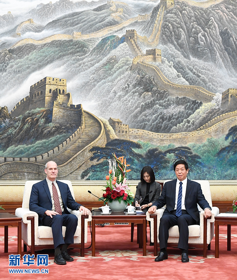3月22日,全國人大常委會(huì)委員長栗戰(zhàn)書在北京人民大會(huì)堂會(huì)見美國眾議院“美中工作小組”代表團(tuán)。 新華社記者申宏攝