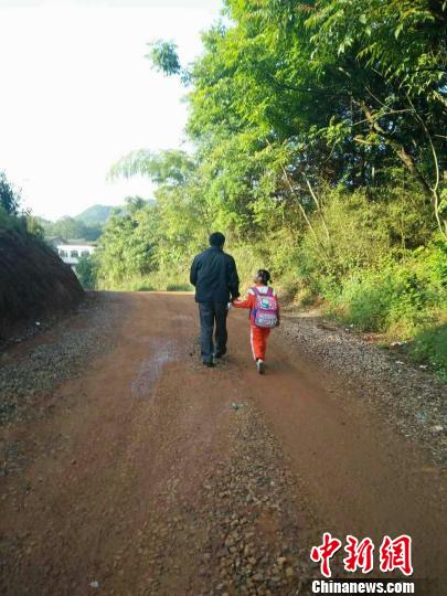 愛心志愿者康雄牽著“事實孤兒”去上學的背景?!¢L沙市岳麓區大愛無疆公益文化促進會供圖 攝