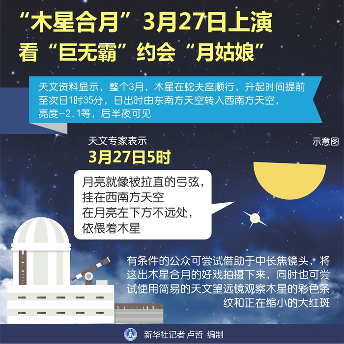新華社天津3月24日電(記者周潤健)繼土星合月、金星合月和火星合月后,本月繁星“逐月”的“浪漫連續劇”27日繼續精彩上演,這一次的“男主角”換成了太陽系的“巨無霸”木星。天文專家表示,屆時,如果天氣晴好,有興趣的公眾和早起出行的人們可于當日黎明前欣賞到這幕浪漫的“星月童話”。