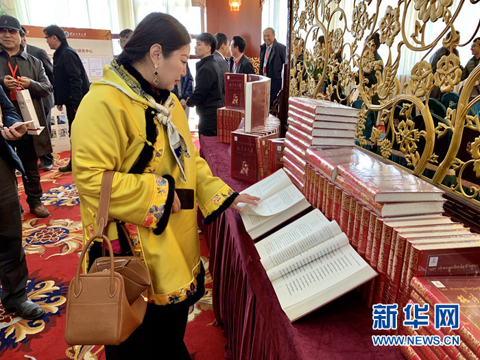 與會嘉賓在發布儀式現場翻閱《格薩爾文庫》。新華網 王頔 攝