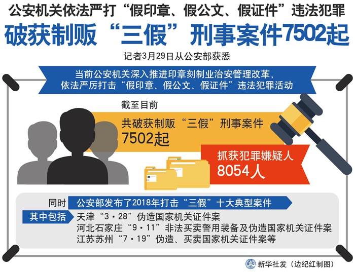 新華社北京3月29日電(記者丁小溪)記者29日從公安部獲悉,當前公安機關深入推進印章刻制業治安管理改革,依法嚴厲打擊“假印章、假公文、假證件”違法犯罪活動,截至目前,共破獲制販“三假”刑事案件7502起,抓獲犯罪嫌疑人8054人。