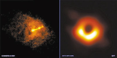 左圖 錢德拉X射線望遠鏡與事件視界望遠鏡同時拍攝的照片,顯示了M87星系中心黑洞的“相對論性噴流”。右圖 事件視界望遠鏡拍攝的M87星系中心黑洞圖像。圖片來源:美國趣味科學(xué)網(wǎng)站