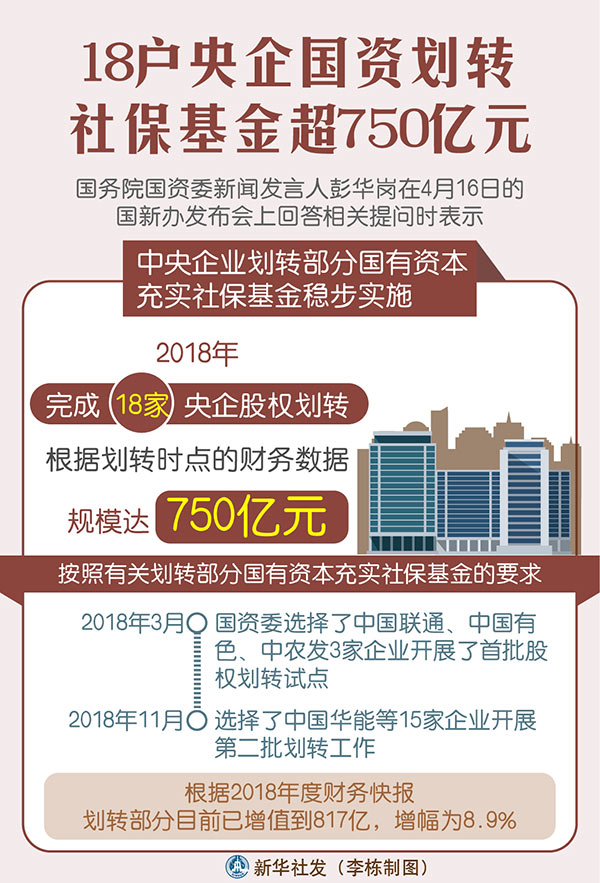 新華社北京4月16日電(記者王希)國務(wù)院國資委新聞發(fā)言人彭華崗16日說,中央企業(yè)劃轉(zhuǎn)部分國有資本充實社保基金穩(wěn)步實施,2018年完成18家央企股權(quán)劃轉(zhuǎn),根據(jù)劃轉(zhuǎn)時點的財務(wù)數(shù)據(jù),規(guī)模達750億元。