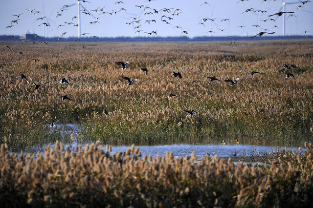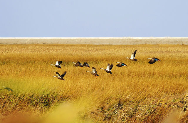 這組照片拍攝于上海著名的崇明東灘濕地,當(dāng)時正值初冬時節(jié)。曲水彎環(huán)的蘆葦叢中,成群結(jié)隊的越冬候鳥時而悠閑覓食,時而群鳥歡飛,譜寫了一曲美妙的自然樂章。