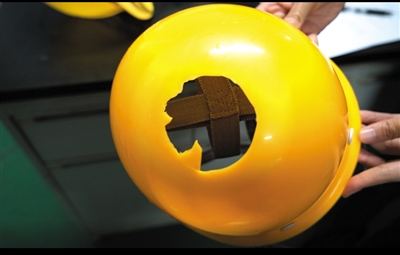 15元安全帽測試后現(xiàn)破洞。新京報(bào)記者 唐躍 攝