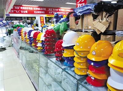 朝陽某大型建材市場內(nèi)有各價(jià)位的安全帽出售,商家稱10余元的需求大。新京報(bào)記者 張熙廷 攝
