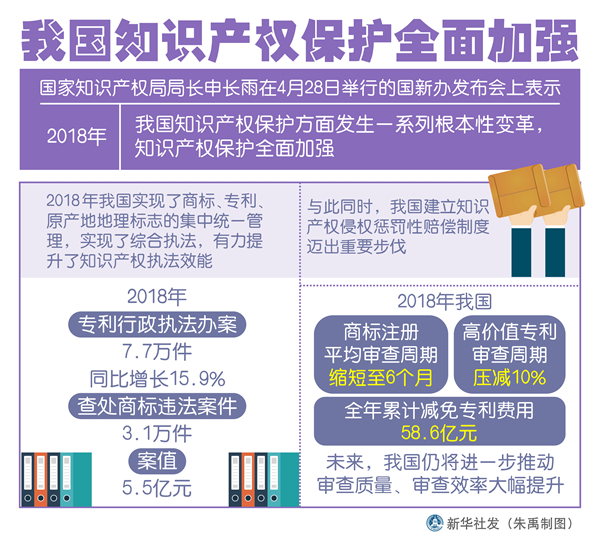新華社北京4月28日電(記者張泉)國家知識產(chǎn)權局局長申長雨在28日舉行的國新辦發(fā)布會上表示,2018年,我國知識產(chǎn)權保護方面發(fā)生一系列根本性變革,知識產(chǎn)權保護全面加強。