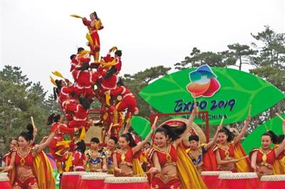 世園會開園首日的花車巡游于上午10時(shí)開始,表演時(shí)間為40分鐘。10時(shí)10分,花車從國際館附近緩緩經(jīng)過,吸引不少游客駐足觀看。