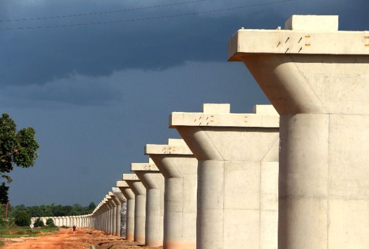 ↑2018年6月14日的老撾萬象楠科內河特大橋橋墩。墩身澆筑完成標志著中老鐵路全線最長橋梁主體工程順利完工。 新華社發