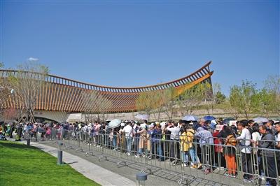 昨日,五一小長(zhǎng)假第一天,世園會(huì)迎來(lái)開園后的首個(gè)客流高峰。圖為當(dāng)日下午三時(shí)許,中國(guó)館前排隊(duì)的游客。新京報(bào)記者 侯少卿 攝