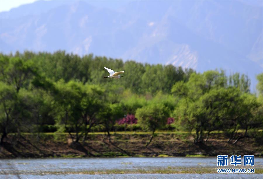 2019年4月30日,水鳥在媯水河畔的自然生態展示區飛翔。 新華社記者 張晨霖 攝
