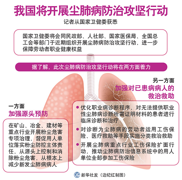 “整個(gè)攻堅(jiān)行動(dòng)包括粉塵危害專(zhuān)項(xiàng)治理、塵肺病病人救治救助、職業(yè)健康監(jiān)督執(zhí)法、用人單位主體責(zé)任落實(shí)以及防治能力提升等五項(xiàng)行動(dòng)。”李斌說(shuō)。
