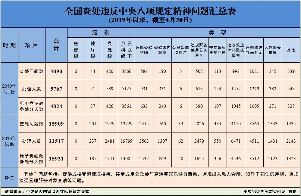 據中央紀委國家監委網站消息,為掌握全國貫徹落實中央八項規定精神情況,中央紀委在各省區市和新疆生產建設兵團、各中央和國家機關、各中央企業和中央金融企業等建立了落實中央八項規定精神情況月報制度。2019年以來,截至4月30日,全國查處違反中央八項規定精神問題情況如下: