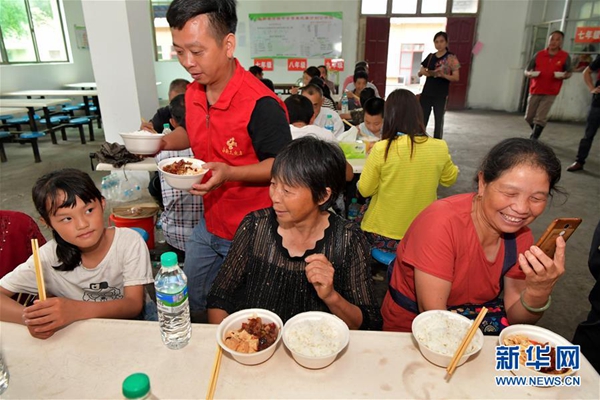 6月9日,在江西省吉安市永新縣高橋樓鎮(zhèn)高橋中學安置點內(nèi),志愿者為受災(zāi)村民端來熱飯熱菜。新華社記者 彭昭之 攝