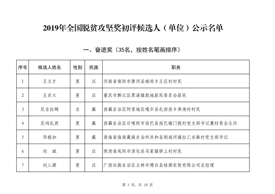 2019年全國脫貧攻堅獎初評候選人(單位)公示公告-新華網