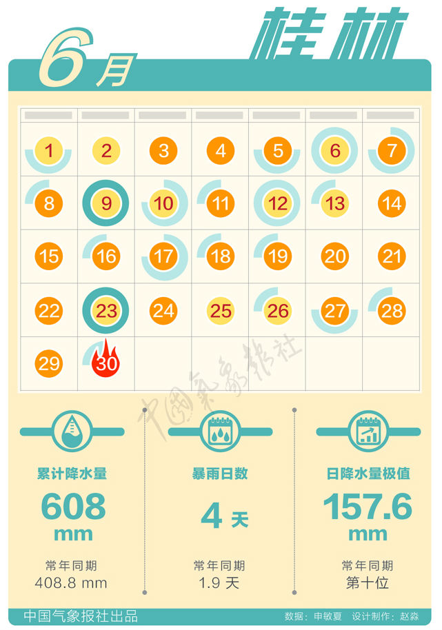 桂林:6月累計雨量大達608毫米,而且暴雨日數多,同時極端性很強。6月6日83.7毫米的日降水量、6月9日157.6毫米的日降水量、6月12日76.2毫米的日降水量,均打破同期歷史記錄極值。6月23日101.5毫米日降水量位居歷史第二。