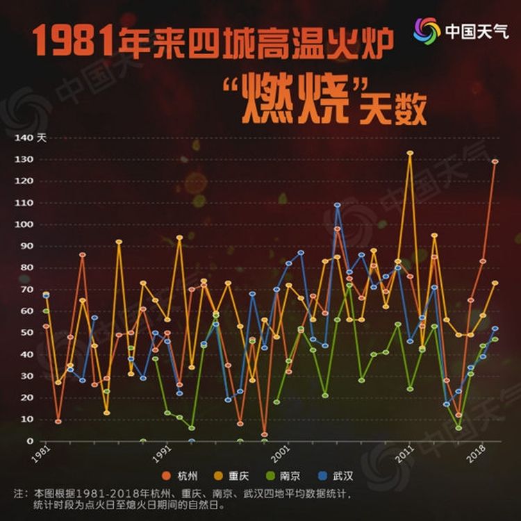 高溫火力全開,人人都覺得自己所在地是火爐。這里先以長(zhǎng)江沿線的重慶、武漢、南京、杭州四城為例。