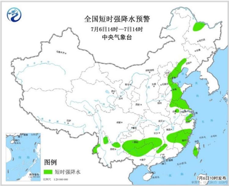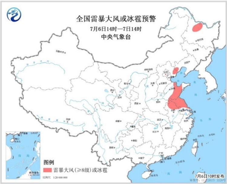 預計7月6日14時至7日14時,黑龍江北部、河北東北部、山東中部、安徽北部、江蘇中北部等地的部分地區將有8-10級雷暴大風或冰雹天氣,局地將出現極端雷暴大風,瞬時風力可達10級以上;黑龍江北部、遼寧西部、河北東部、北京東部、天津、山東中部、安徽東北部、江蘇中北部、云南西部和北部、貴州南部、湖南中南部、江西中部、浙江北部和南部、福建中北部、廣西北部以及廣東北部等地的部分地區將有短時強降水,小時雨量20-50毫米,局地可達70毫米以上。