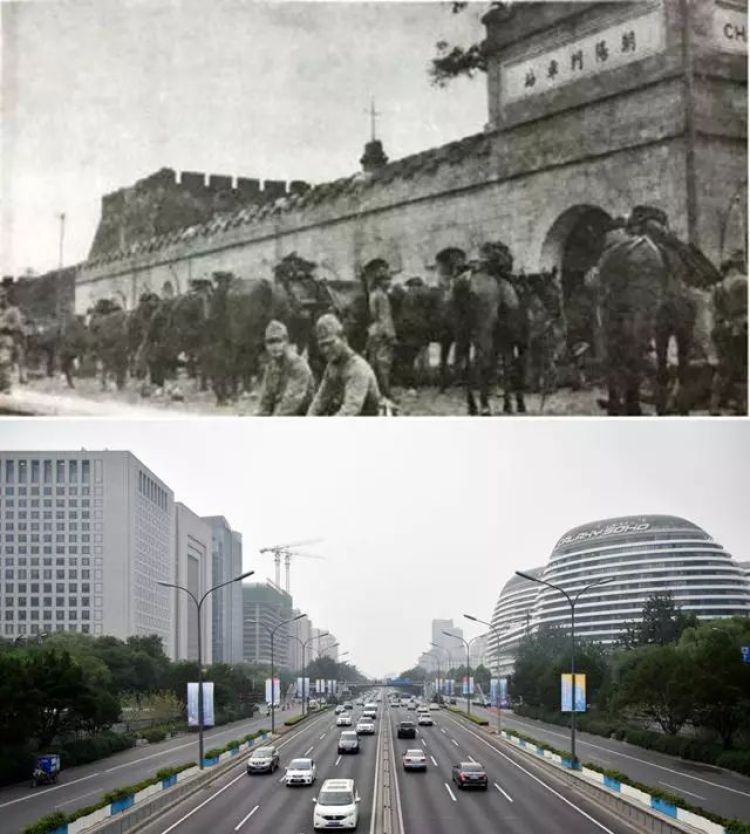 上圖為1937年8月8日,日本騎兵在朝陽門車站集結(資料照片);下圖為2017年7月3日拍攝的朝陽門地區(qū)(新華社記者 張晨霖 攝)。