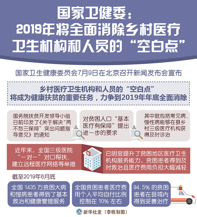 新華社北京7月9日電(記者屈婷、王秉陽)少數地區仍有衛生室“空白村”,“三區三州”深度貧困地區有的鄉鎮缺少全科醫生……國家衛生健康委員會9日在京召開新聞發布會宣布,像上述這些鄉村醫療衛生機構和人員的“空白點”,將成為健康扶貧的重要任務,力爭到今年年底全面消除。