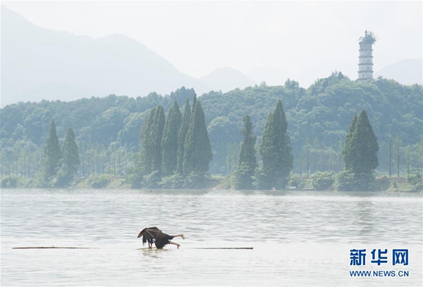 新華社杭州7月11日電(記者商意盈) 江面浩渺,霧氣氤氳。11日上午,浙江新安江上,一根大約8米長的毛竹越江而來,毛竹上站立著一位身穿蓑衣、頭戴斗笠的精瘦男子。他用手中的細竹竿作槳,輕輕劃水,不多時,人已到江心。