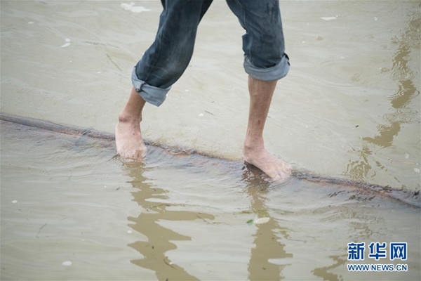 7月11日,方恕云在毛竹上做俯臥撐。54歲的浙江建德農民方恕云,自少年時就開始練習站在一根毛竹上渡江的絕技,還能做俯臥撐、抬腳跳等動作,在水中“如履平地”。新華社記者 翁忻旸 攝