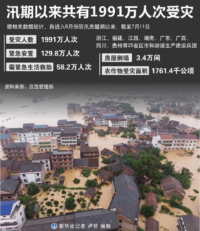 新華社北京7月11日電(記者葉昊鳴)記者11日從應急管理部獲悉,自進入6月份防汛關鍵期以來,截至7月11日,共有1991萬人次受災,129.8萬人次緊急安置,58.2萬人次需緊急生活救助。