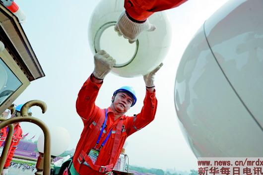 升降車抬起,卸下燈球、高壓氣槍清除污物、檢查線路和器件、清洗燈球、安裝燈泡……華燈班隊員們動作嫻熟、配合默契,儼然一條空中的流動生產線。