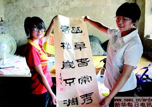 在“手拉手、共成長”活動中,石外學生向山區學校小伙伴贈送書法作品。受訪者供圖