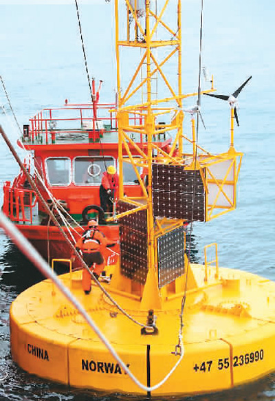 2012年8月4日,中國科考隊員在挪威海域布放中國首個極地大型海洋觀測浮標。新華社發