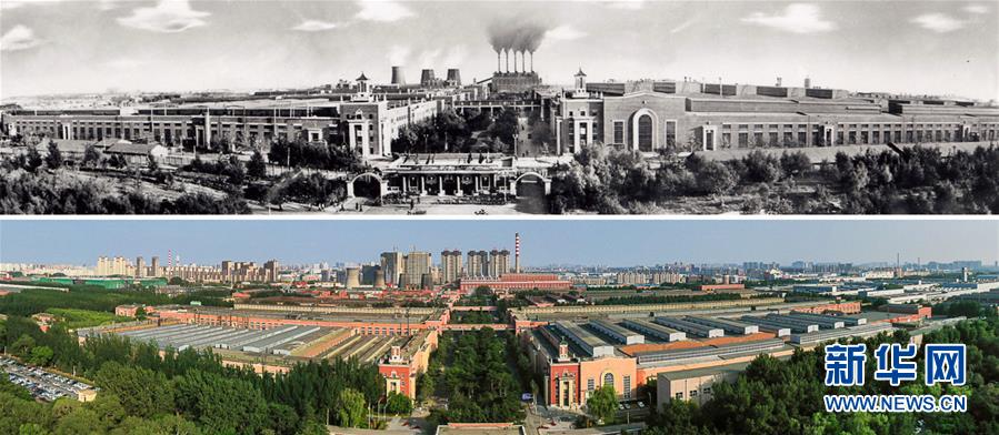 拼版照片:上圖為20世紀50年代的第一汽車制造廠廠區(資料圖片);下圖為2019年6月12日無人機拍攝的一汽廠區全景(新華社記者 許暢 攝)。新華社發