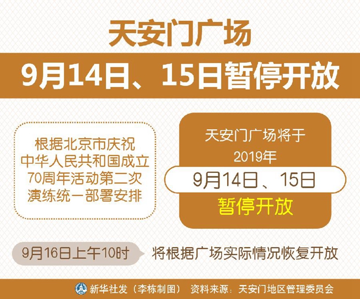 新華社北京9月11日電(記者魯暢)記者從天安門地區管理委員會獲悉,根據北京市慶祝中華人民共和國成立70周年活動第二次演練統一部署安排,天安門廣場將于2019年9月14日、15日暫停開放。9月16日上午10時,將根據廣場實際情況恢復開放。