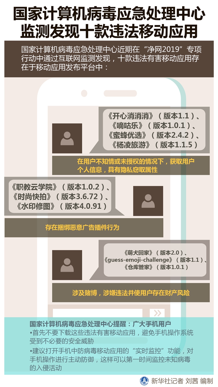 新華社天津9月15日電(記者張建新)國家計算機(jī)病毒應(yīng)急處理中心近期在“凈網(wǎng)2019”專項行動中通過互聯(lián)網(wǎng)監(jiān)測發(fā)現(xiàn),十款違法有害移動應(yīng)用存在于移動應(yīng)用發(fā)布平臺中,其主要危害涉及隱私竊取、私自下載和賭博三類。這些違法有害移動應(yīng)用具體如下: