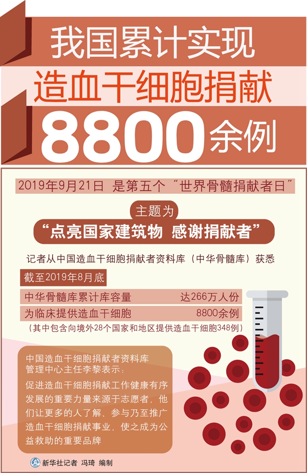 新華社西安9月21日電(記者藺娟 吳鴻波)記者從中國造血干細胞捐獻者資料庫(中華骨髓庫)獲悉,截至2019年8月底,中華骨髓庫累計庫容量已達266萬人份,為臨床提供造血干細胞8800余例,其中包含向境外28個國家和地區(qū)提供造血干細胞348例。