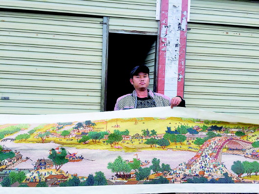 七米多長的刺繡,要三個人一起拿著才能全部展示,上面的人物栩栩如生。吳琰花了三年時間,用了72種不同顏色的線,繡成了這幅有400多個人物形象的十字繡。“橋這個地方最難繡,人流太密集,光這一小段就花了三個多月時間。”他指著刺繡上那座人流如織的大橋說。