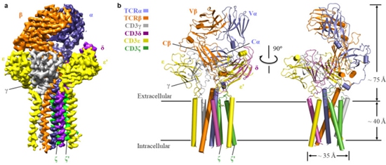 對此,文章審稿人的評價是:“該研究工作代表了細胞適應性免疫的分子機理研究的一個重要里程碑。通過闡明第一個在膜上組裝的T細胞受體和其CD3共受體的結構,極大地增加了我們對T細胞識別抗原反應的激活機制的理解。”