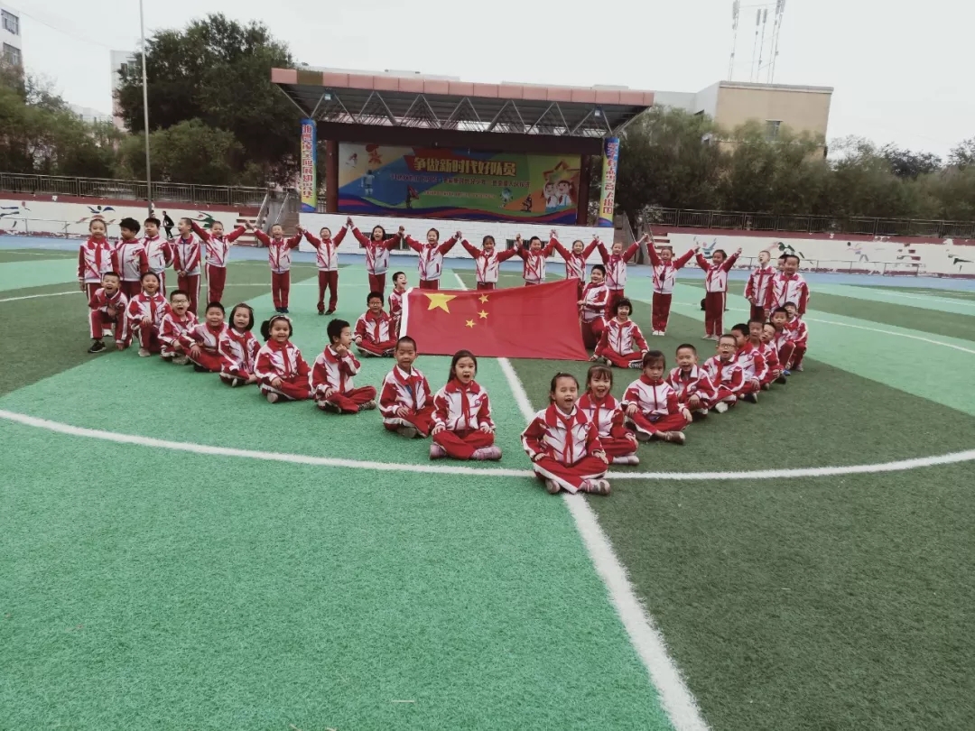 2019年9月26日,江蘇邳州。鐵富鎮中心小學少先隊員們手擎國旗,祝福祖國生日快樂!作者:時光漫步