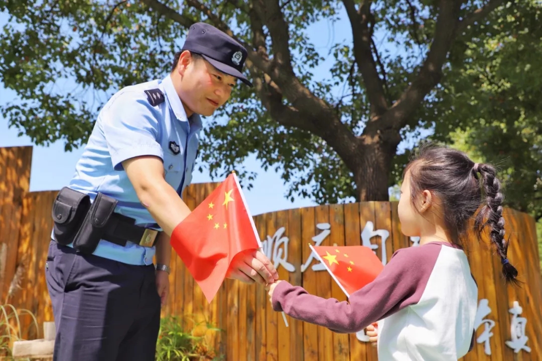 2019年9月23日,江蘇揚中。小朋友看到執勤的警察叔叔,遞上了手中的國旗。作者:曉媛